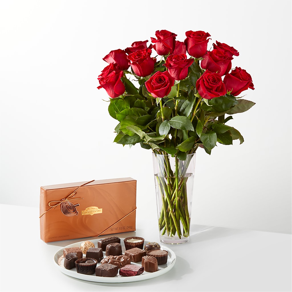 A bouquet of 18 roses and foliage paired with a gift box of assorted chocolates.